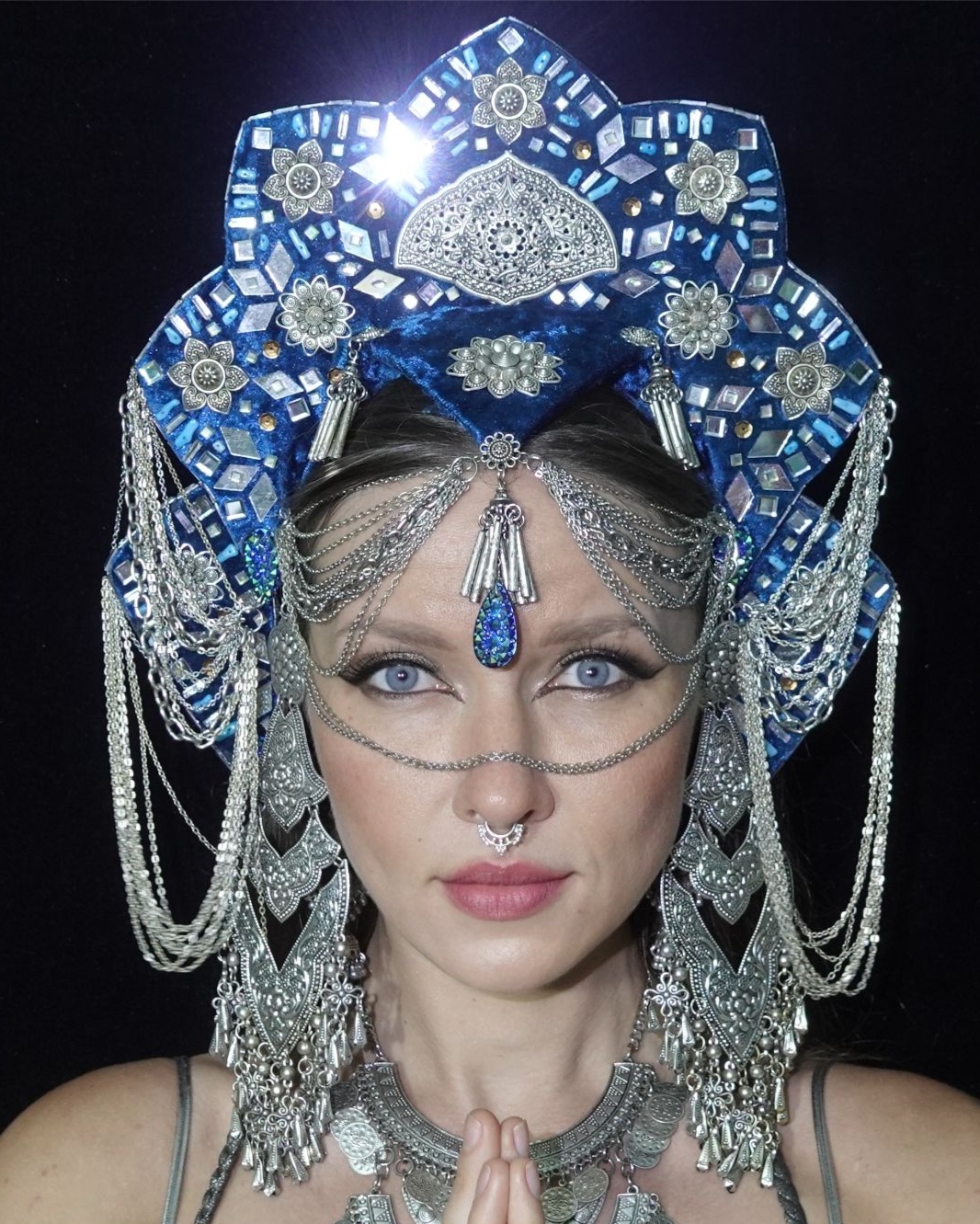Shiva Mirrored Crown – Silver Tribal Fusion Headpiece with Blue Mirrors, Ethnic Costume Headdress for Stage, Dance & Festival
