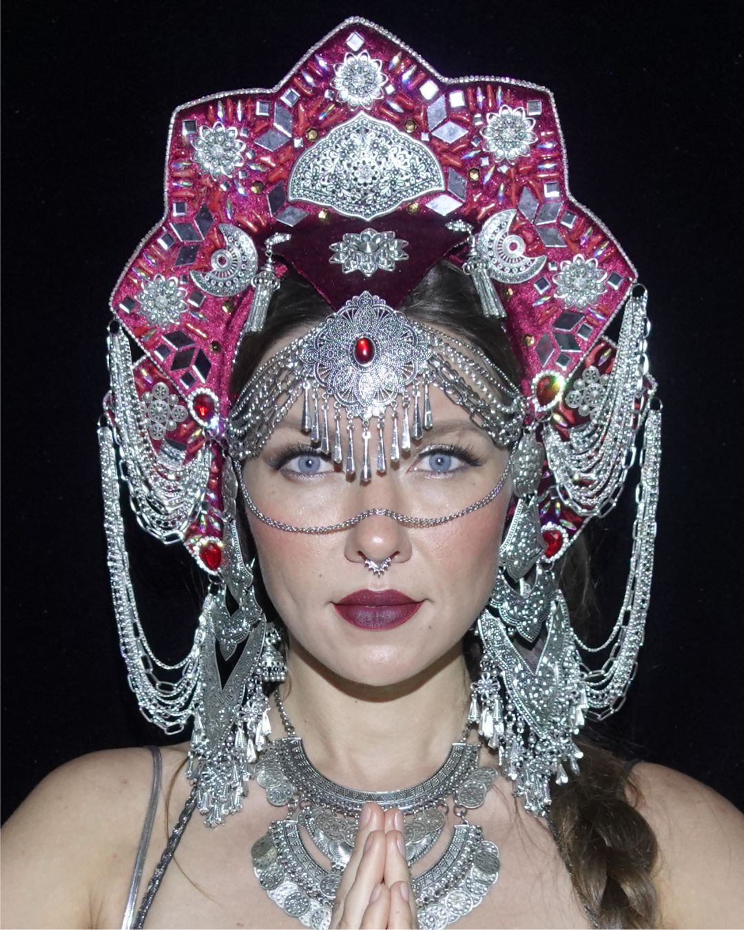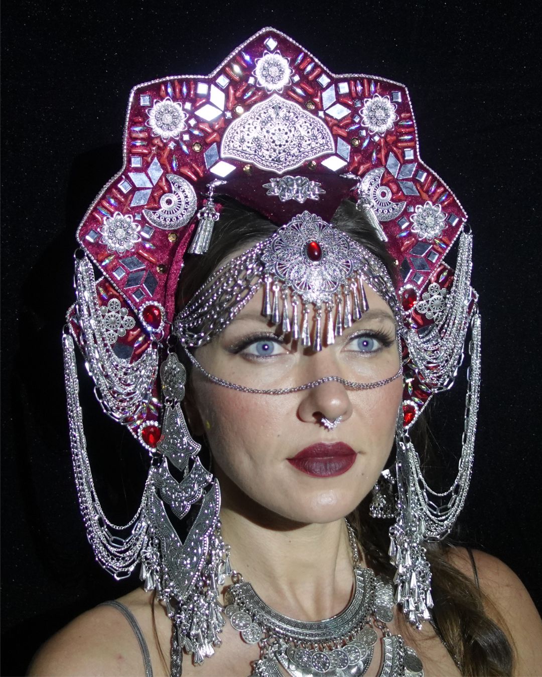 This fabulous and mystical crown is set on a velvet background and decorated with natural coral beads, mirrors, ethnic jewelry, and signature chain embellishments. The nose chain is removable. This crown will create a memorable and magical look for tribal fusion dance, festivals, concerts, photo shoots, video shoots, and fire shows. The crown’s style combines ethnicity, femininity, and mystery. Its secure fastening allows for free movement and dance.